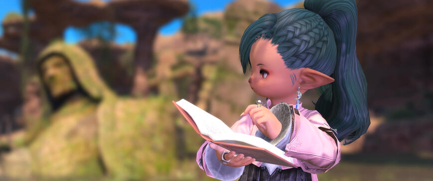 Once upon a time there was a rumor in certain circles of a young lady who left the Arrzaneth Ossuary, cutting short a promising career as a thaumaturge. Quickly she earned a reputation for her loud opposition to the Syndicate, until she suddenly vanished during the rise of the Defiant. Among the shady mages of Ul'Dah this raised no suspicion. Many left to join their ranks, drawn to the prospect of changing the world for the better. Many died when the Warrior of Light smothered their fire.She survived, still carrying the torch of her desire to change Ul'Dahn society and was quickly caught up in the underground world of political agitants. When her own hubris and zeal got others killed, she left. For want of something to do with her hands she returned to something she knew well: Learning and writing down peoples' stories. A friend and a mentor encouraged and sponsored her to enroll in the Studium where she studied folklore and further refined her magic. Now she's returned from Sharlayan to complete her thesis.